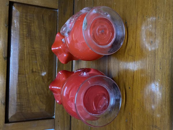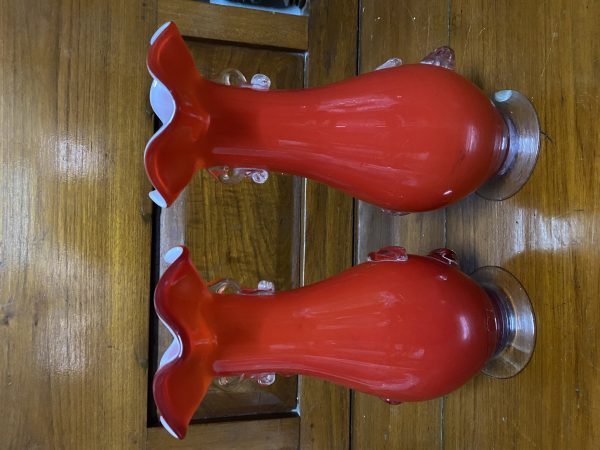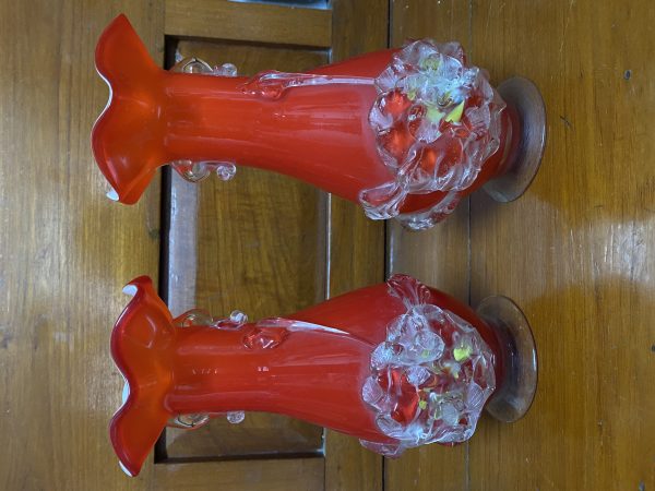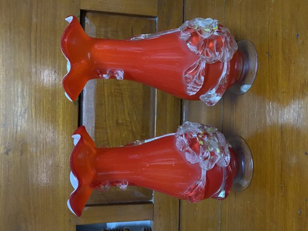 แจกันต่างประเทศ งานสมัยเก่าขึ้นรูปโดยปากเป่าและมือจับดอก สีแดงสดมีลายดอกข้างล่าง เป็นงานทำขึ้นรูปด้วยมือ ไม่มีซำ้แบบกัน