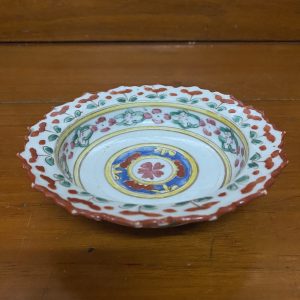 ถาดกระเบื้องโบราณแบบหายากไม่มีปีกขอบ ขนาด 12 "ลาย พวงช่อองุ่นพร้อมก้านและใบ สีขาวฟ้า จับขอบพร้อมหูและดุมขา