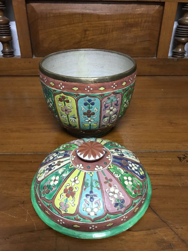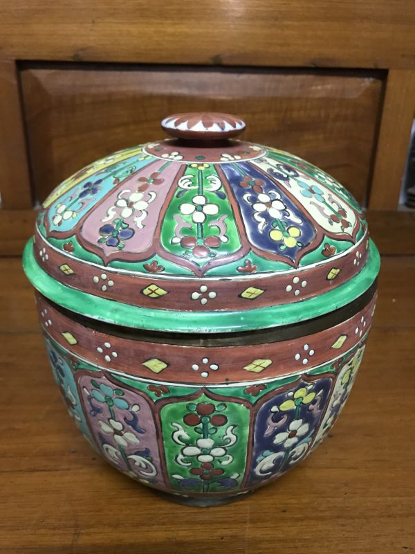 โถกระเบื้องเบญจรงค์สมัยอยุธยาตอนปลาย(รัตนโกสินทร์ตอนต้น) พร้อมฝา ลายกระจก สภาพค่อนข้างสมบูรณ์มีร้าว2เส้น ซ่อมสีที่เห็นภายในเล็กน้อย